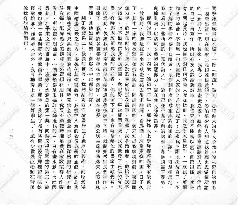 我由小学开始就热爱两门功课。一是图画,一是国文,我喜欢画画,同时也爱看书,记得在四年级时画的画就被老师拿到五六年级的班上去给他们看。五年级时我的一篇「流亡五年」在湖南祁阳梧溪日报上刊出之后,赢得了不少人的眼泪与同情的信函。这两条平行的志趣一直维持到我进入师大艺术系才有所消长。在这之前上,我是以真名与鲁亭、尔眉、意清的笔名发表我的文章,我发表过的第一首新诗,是高中一年级时写的「哥儿们」,在自由中国杂志上刊出。中学生杂志上也常有我的散文。到高二下学期期考前不久,我才决定专攻绘画的,于是高三没读就以同等学历考进了师大艺术系,正式开始了艺术的旅程。在二年级以前还念念不忘地写新诗,与当时旁系同学陈慧与童山合编了一份「细流」诗刊,那时台大的诗人余光中的「蓝色的羽毛」还未出版。现在说来已是很远很远的了,恐怕很少有人知道我曾经也想做个所谓的「新诗人」吧。后来,我专心一意地画画之后,虽然也常常读读别人的诗,但由于自己不再写作,所以有友人谈论新诗时,我从来也不插嘴以表示自己很懂,就是有入问起我时,我也从不对任何新诗人妄加批评。我之所以这样作,一来我了解创作者的辛苦,不能用一句话就把人家的辛苦给否定了;二来我不断地提醒自己,不太了解的事情不要信口雌黄,以作到作者的尊重与对艺术的「诚」。可是相反地,我却看到一些所谓的「现代诗人」,对自己并不甚了解的绘画,却侈谈高下优劣,胡捧乱骂,以造成文艺界的恶势力,实在使人啼笑皆非。