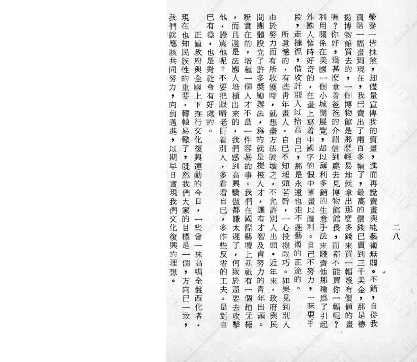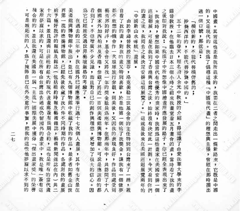 在过去的三年中,我在国外已经应邀举行过十七次个人画展,其中有七次是在美术馆与博物馆中展出,并已有九个博物馆中收藏了我的作品,最多者如旧金山世界第一流的德扬博物馆,已经先后收藏了我六件不同时期的作品。各处对我的画展给予极好批评的报纸及杂志(包括纽约时报及艺术杂志,艺术新闻杂志在内)共二十六篇。并且还与目前纽约最大的现代画画廊签有长期合约,这也是所有的当代画家所梦寐以求的,可是在所有由台湾出去过或仍留国外的画家中,我是唯一签有这种合约的。并且我还在美国第一届「主流」国际美展中获得「杰出画家奬」的荣誉。可是嫉妬我的人,为了掩饰自已在外失意的事实,把我的这些他梦寐以求不到的荣誉一皆抹煞,却尽量宣传我的卖画,进而再说卖画与纯艺术无关。不错,自从我卖第一幅画到现在,我已卖出了两百多幅了,最高的价钱已卖到三千美金,那是德扬博物馆买去的,一个博物馆是那么轻易地就拿出那么多钱来买一幅没有价値的画吗?你好,为甚么拿着爸爸的介绍信到处去见博物馆馆长,而都不能买你一幅呢?利用关系在美国一个小城开展览,却以薄利多销的生意手法来贱卖他那种为了引起外国人暂时好奇的,在画上写着中国字的假中国画以图利。自己不努力,一味耍手段,走快捷方式,借攻讦别人以抬高自己,那是永远也走不进艺术的正途的。