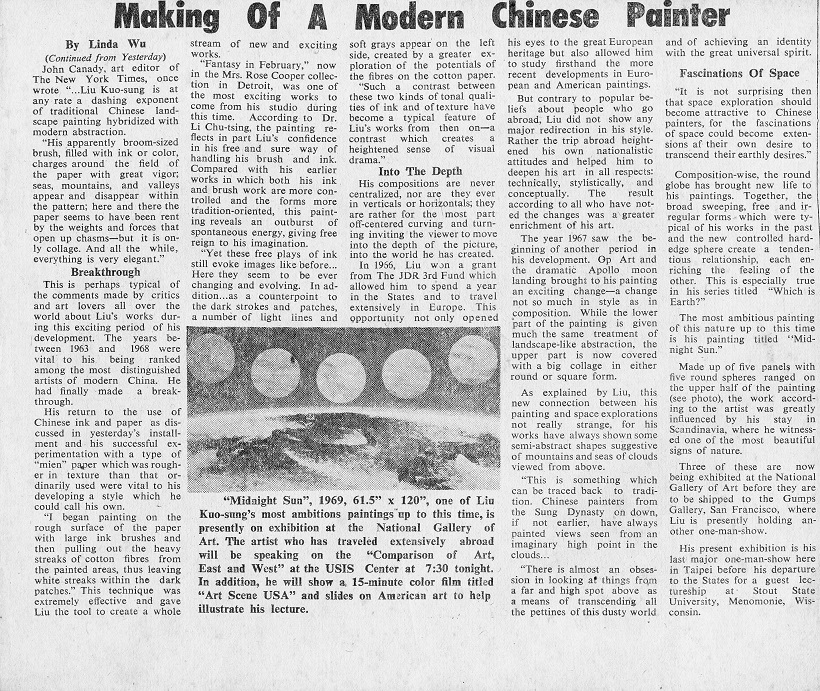 The magnificent young man with a brush - this is Liu Kuo-sung. China’s contribution to the contemporary art world. His one-man-show at the National Gallery of Art which opened last Sunday is perhaps the most exciting exhibition of its nature to come to Taipei this year.