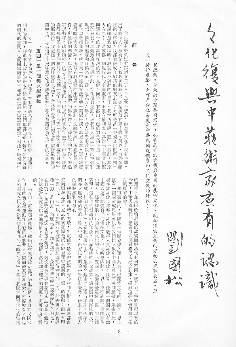 我已經有很久沒有寫過文章了。不是我不想寫,而是我實在沒有時間。為了我個人的藝術創作,我必須將我的全副精神放在畫上去。所以,有許多雜誌邀我寫稿,我都謝絕或介紹其他朋友去寫了。可是當「中國文化復興月刊」的編輯邀我寫稿時,我就義不容辭的接受了。我之所以說「義」不容辭,其原因有二:一是做爲一個現代的中國畫家,不但有權利表示其對「中國文化復興運動」的理論與作法的個人見解,同時也有獻出自己的力量給予這一偉大運動的義務。二是政府所倡導的此一文化復興運動,與我個人過去一貫的主張和理想、創作的態度和目標完全一致。遠在五六年前,詩人余光中敎授,作曲家許常惠敎授和我,就曾爲「中國的文藝復興」開過座談,寫過文章。那時我總覺得時機尙未成熟,所以在我所寫的東西裡,只就「文藝復興」所應具備的條件,所應作的準備,以及對過去「五四運動」的得失作了一番檢討的工作。雖然事過數年,政府所推行的「文化復興運動」也已濄了兩個多年頭了,但是,我總覺得那時候所提出的檢討並未受到一般人的注意。今天「中國文化復興月刊」的編輯給了我這様一個大好機會,我想,在我尙未談到正題之前,借諸這寶貴的篇幅,再一次提出,作爲中華文化復興運動推行委員會諸委員先生們的參考。