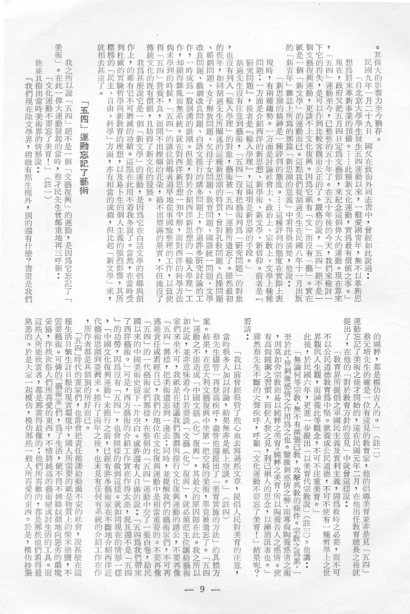 我之所以說「五四」絕不是一個「文藝復興」的運動,是因為它忘記了「美術」。在此一偉大運動發起的當時,蔡孑民先生曾鄭重地再三呼籲:「文化運動不要忘了美育!」 (註一)