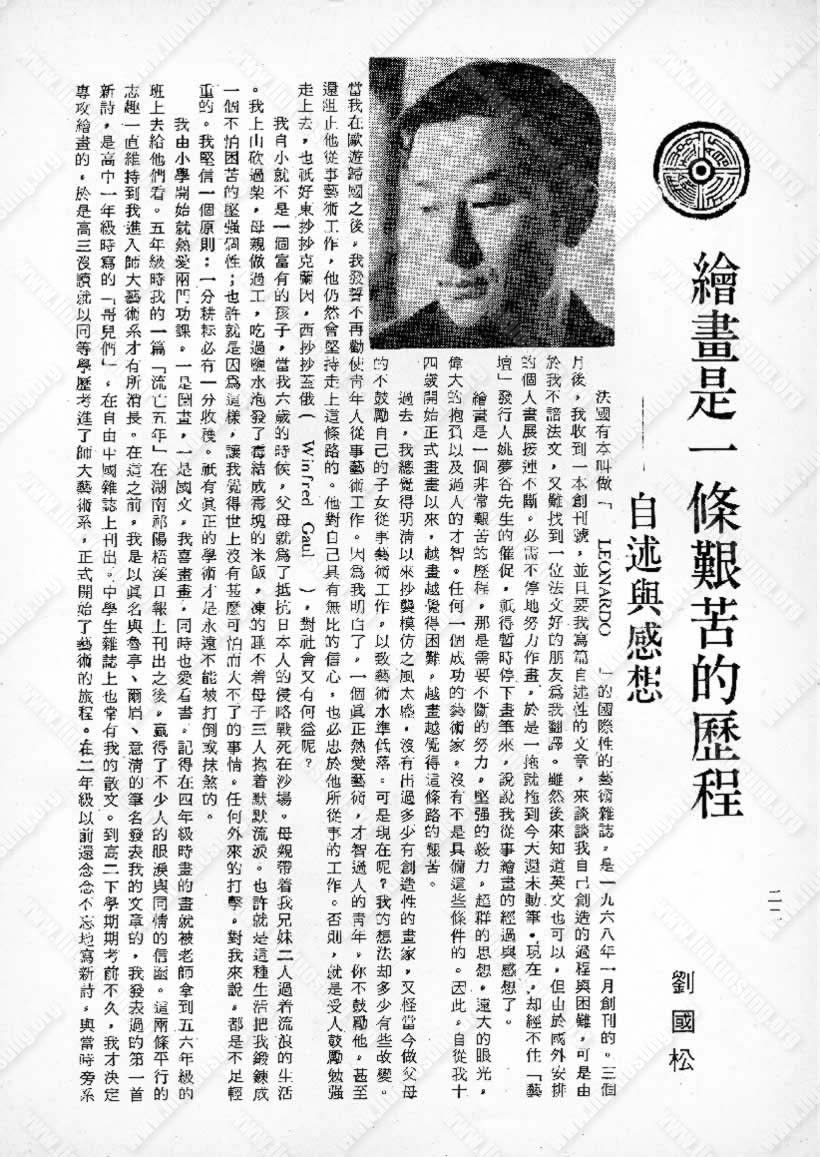 法國有本叫做「LEONARDO」的國際性的藝術雜誌,是一九六八年一月創刊的。三個月後,我收到一本創刊號,並且要我寫篇自述性的文章,來談談我自己創造的過程與困難,可是由於我不諳法文,又難找 一位法文好的朋友為我翻譯。雖然後來知道英文也可以,但由於國外安排的個人畫展接連不斷,必需不停地努力作畫,於是一拖到拖今天還未動筆,現在,却經不住「藝壇」發行人姚夢谷先生的催促,只得暫停下畫筆來,說說我從事繪畫的經過與感想了。