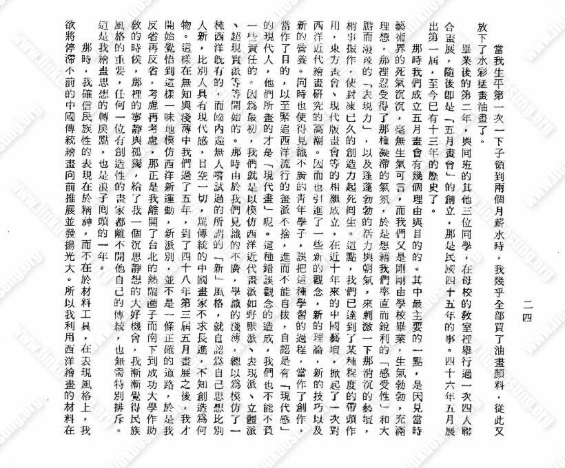那時,我確信民族性的表現在於精神,而不在於材料工具,在表覡風格上,我欲將停滯不前的中國傳統繪畫向前推展並發揚光大。所以我利用西洋繪畫的材料在油畫布上來表現水墨潑灑的趣味,我就這樣地畫了兩年,也畫了不少這類風格的大畫。也就在這時候,我把我的想法吿訴了五月畫會中一個親密的畫友,起先他還與我辯論,經過三個晚上的交談後,他於是接受了的思想。將當時正拿著一本菲律賓畫家騷貝爾(Fernando Zobel) 的畫集,模仿着畫那種放射性的畫完全丟掉,開始在油布上畫水墨畫了,開始時模仿宋代的山水畫並加以抽象之,效果很好,我也就因為又有一位畫友與我一起向我的理想邁進,同時怕他會以爲我外面說他是受我的影響,所以我處處捧他,誰知他的自卑感作祟,從此卻在背後暗地裡坡壞我。隨後做出許許多多不可吿人的不仁不義的事情來。實在叫人痛心