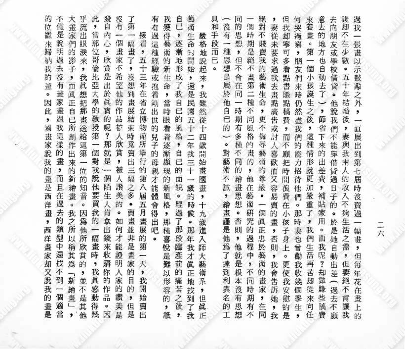 另一方面,在生活上亦遭到同樣的境遇。除了第一屆五月畫展時,教育部長買過我一張畫以示鼓勵之外,一直展出到第七屆時沒賣過一幅畫,但每年花在畫上的錢却不在少數。五十年結婚後,妻與我兩人的收入不夠生活之需,但妻絕不肯讓我去向朋友或學校借貸。他說我們不能靠借貸過日子的。於是她自動出差(過去不願去的地方也自動去了),節省下來的出差費,補貼家用。而我呢?却靠賺些稿費來養畫。第一個小孩誕生之後,這種情形就更加嚴重了,我們生活再苦却從來向任何哭過窮,朋友們來時仍然盡我們的能力招待他們。那時妻也會勸我收幾個學生,但我却寧可多看點書賺點稿費,而不願把時間浪費在小孩子身上。更使我安慰的是,妻從未要求過我去畫點廣吿或討人喜歡而又容易賣的畫,否則,我會吿訴她,我絕對不賤賣我的藝術生命,更不侮辱藝術的尊嚴。一個真正忠於藝術的畫家,在同一個時期是絕不畫第二種不同風格的畫的,他在藝術研究的過程中,不同時期有不同的思想,但不會在同一時期有多種不同的繪畫思想。否則,他就是根本沒有思想(沒有一種思想是屬於他自已的)。對藝術不諴,繪畫謹是他爲了達到利與名的工具和手段而已。