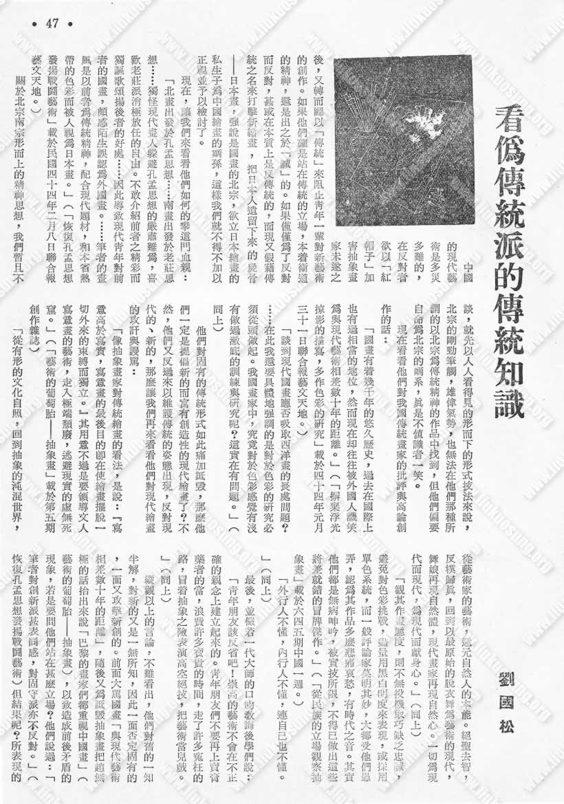 中国的现代艺术是多灾多难的,在反对者欲以「红帽子」加害抽象画家未遂之后,又转而图以「传统」来阻止青年一辈对新艺术的创作。如果他们确是站在传统的立场,本着卫道的精神,还是出之于「诚」的。如果仅仅为了反对而反对,甚或在本质上是反传统的,而现又假藉传统之名来打击新绘画,把日本人遗留下来的尸骨──日本画,强说是国画的北宗,欲立日本绘画的私生子为中国绘画的嫡孙,这样我们就不得不加以正视并予以检讨了。