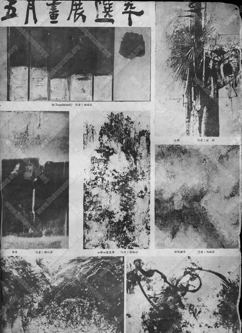 今年「五月画展」里:顾福生的「闭」,是四月个展里,无人过问的。庄喆的「自剖」,远不如苍凉伟岸的「古舟」令人兴感了。为什么他不画晨曦和渔村夜寂那一类牵人情思的画呢?韩湘宁的「事件」,教人从哪儿去探索故事或是标题的暗示呢?刘国松的「如歌如哭泉声」不是很像范宽的「临流独坐图」的稿本吗?为什么他不能用笔勾勒皴染,却让色彩像屋漏雨痕似的,布置这种画面,是彩油自流自动的偶然现象呢?还是刘─创作人─有意识的创造呢?冯钟睿的「弦之扩张之一」弦在哪里?周围的色泽,要人感觉一种什么气氛呢?郭东荣的「作品」是不是帕洛克无定象画的再现呢?胡奇中的「绘画」61-6不是更和人迷网,莫名作家的意志所在吗?……