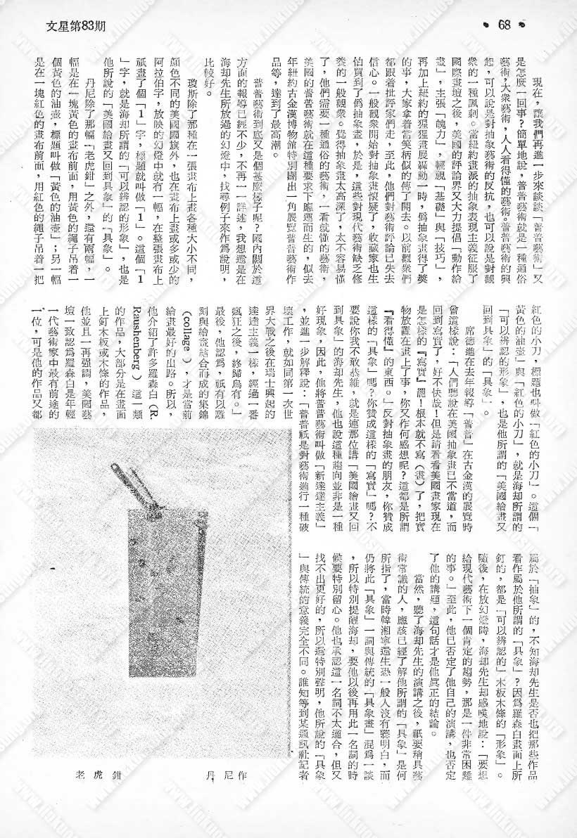 可是,海却先生三十五分钟的讲演太不精彩,由美国的早期绘画完全模仿欧洲谈起,那一年怎样那一年又怎样,简直是在报吿流水账,所放映的幻灯片也不新鲜,讲词实在不値一提。万想不到,在演讲的第二天,居然台北各大报纸都以很大的篇幅刊出了其通讯社的新闻稿,大事渲染,但读过内容之后,发现与海却先生的讲词有些不符,同时也报导的很不淸楚。之所以如此,可能是因那个讲题的关系。可是许多未去听讲的读者,都受了这错误报导的影响,认为抽象画已经没落,世界艺术的趋势又回到「具象」,更有些保守的具象画家,心中暗自得意,以为他那「以不变应万变」的观念是百无一失,还有那些咒骂抽象画而说不出理由的人,这下子可得到一个洋人替他出气了。抽象画在西洋已经走下坡了,在中国还搞甚么呢?这种「艺术殖民地」(借用余光中语)的思想一直影响了很多思想未成熟或没有思想的人。先不说为了「民族的自尊心」,不管那洋人说的对不对,但起码,我们总应该将海却演讲的内容先弄个淸楚,不该道听途说受了外行人错误报导的害。