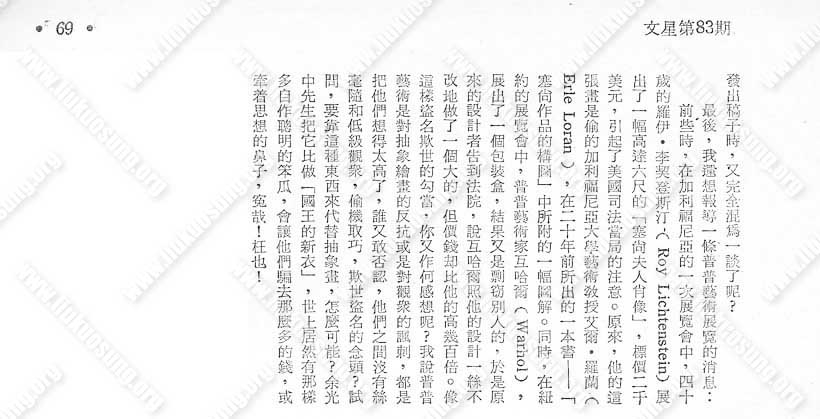 前些时,在加利福尼亚的一次展览会中,四十岁的罗伊‧李契登斯汀(Roy Lichtenstein)展出了一幅高达六尺的「塞尙夫人肖像」,标价二千美元,引起了美国司法当局的注意。原来,他的这张画是偷的加利福尼亚大学艺术敎授艾尔‧罗闉(Erle Loran) ,在二十年前所出的一本书──「塞尚作品的构图」中所附的一幅图解。同时,在纽约的展览会中,普普艺术家互哈尔(Warhol),展出了一个包装盒,结果又是剽窃别人的,于是原来的设计者吿到法院,说互哈尔照他的设计一丝不改地做了一个大的,但价钱却比他的高几百倍。像这样盗名欺世的勾当,你又作何感想呢?我说普普艺术是对抽象绘画的反抗或是对观众的讽刺,都是把他们想得太高了,谁又敢否认,他们之间没有丝毫随和低级观众,偷机取巧,欺世盗名的念头?试问,要靠这种东西来代替抽象画,怎么可能?余光中先生把它比做「国王的新衣」,世上居然有那样多自作聪明的笨瓜,会让他们骗去那么多的钱,或牵着思想的鼻子,冤哉!枉也!