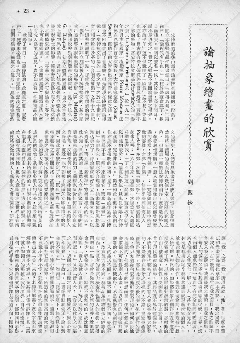 宋陳師道的後山談叢論畫裡有這樣的一段話:「閻立本觀張僧繇江凌畫壁曰:『虛得名爾。』再往曰:『猶近代名手也。』三往於是寢食其下,數日而後去。夫閻以畫名一代,其於張,高下間耳,而不足以知之。世之人強其不能而論能者之得失,不亦疏乎?」這不但說明了「欣賞」之不易,並且也道出了自古即有些人偏愛評論自以為懂而實際不了解的事物。當史特拉文斯基(Strawinky)的「春之祭(Le Sacre du Printemps)」於一九一三年五月由法國第一流指揮家Pierre Monteux 任指揮在巴黎作首次演奏時,大作曲家聖桑(Saint Saens)僅聽了由大管奏出之高音色旋律之後,就頭也不回地走出了音樂廳。但是到現代時報詞論却說:「史特拉文斯基的『春之祭』之於二十世紀,實在相當於貝多芬的『合唱交響樂』之於十九世紀。」這些都證明了一點,那就是一件有價值的藝術「創作」,並非立刻即被人了解而接受的,甚至家喻戶曉領導野獸主義運動的馬蒂斯(H. Matisse),以他那股幹勁與對藝術上的貢獻,見了布拉克(G. Braque) 初期立體風的畫時,也不免本能地說上兩句風涼話呢。當時的他那裡想到立體主義的發展對後世的影響,遠較野獸派為大呢?所以沈顥早在明時就說過:「專摹一家不可與論畫;專好一家不可與論鑑畫。」(畫塵遇鑑篇)因為那些人都已有先入為主的成見。豈不知欣賞一件藝術品不應一途而取。