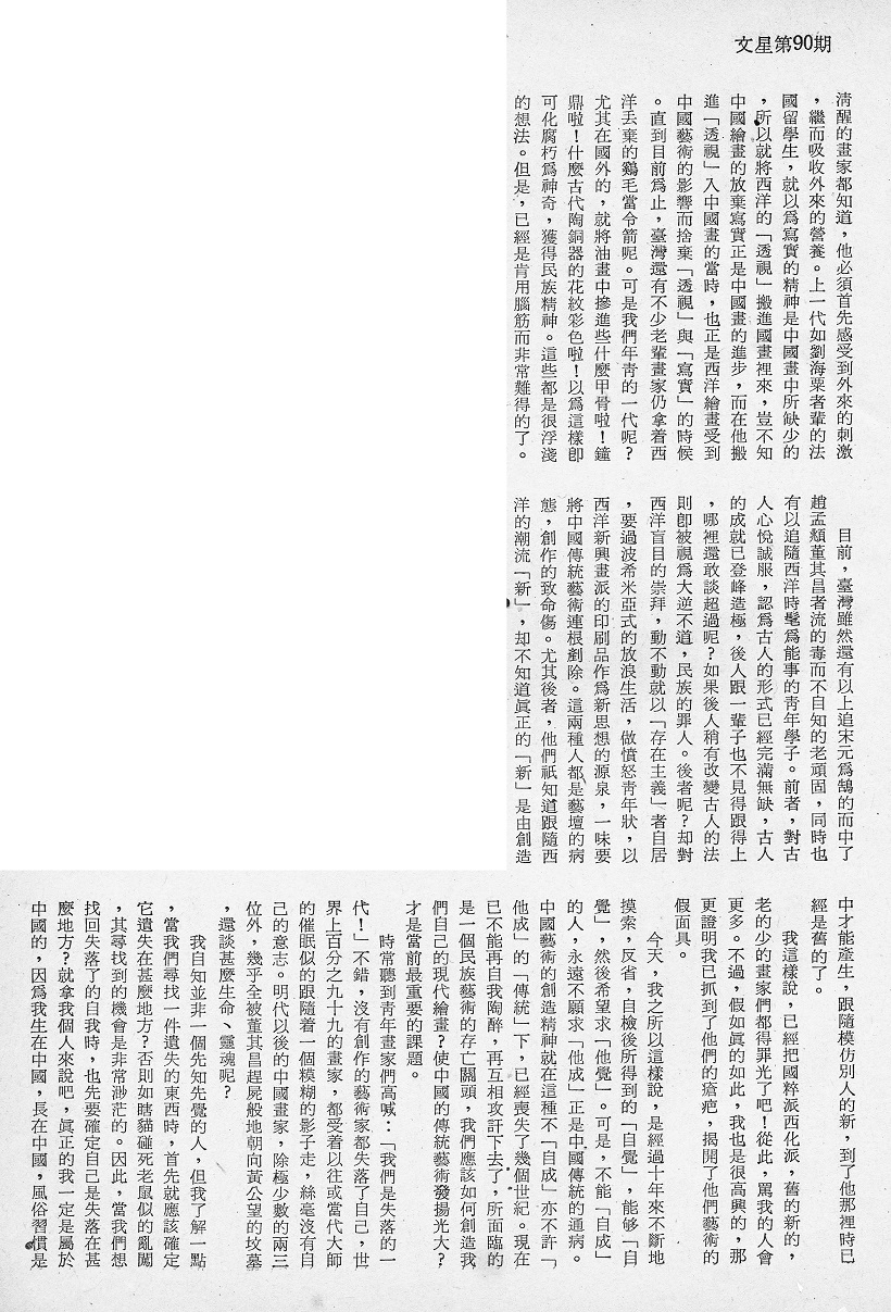 目前,臺灣雖然還有以上追宋元爲鵠的而中了趙孟頫董其昌者流的毒而不自知的老頑固,同時也有以追隨西洋時髦爲能事的靑年學子。前者,對古人心悅誠服,認爲古人的形式已經完滿無缺,古人的成就已登峰造極,後人跟一輩子也不見得跟得上,哪裡還敢談超過呢?如果後人稍有改古人的法則卽被視爲大逆不道,民族的罪人。後者呢?却對西洋盲目的崇拜,動不動就以「存在主義」者自居,要過波希米亞式的放浪生活,做憤怒靑年狀,以西洋新興畫派的印刷品作爲新思想的源泉,一味要將中國傅統藝術連根剷除。這兩種人都是藝壇的病態,創作的致命傷。尤其後者,他們只知道跟隨西洋的潮流「新」,却不知道眞正的「新」是由創造中才能產生,跟隨模仿別人的新,到了他那裡時已經是舊的了。