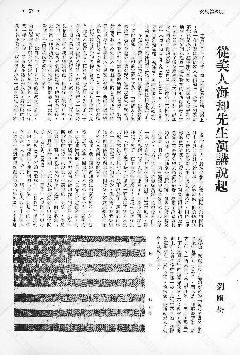 在此,我不願將海却先生的講詞複頌一遍,也沒有那個必要,因爲實在不值得。唯一需要說明的,就是他所用的「具象」(object)這個名詞,到底是指的些甚麼?根據當時海却先生的解釋以及他所放映的幻燈片的說明,他所說的「具象」,卽是在畫面上有「可以辨認的形象」之意,而這形象「又與日常生活有關」。在他放咉的幻燈片中是拿瓊斯(Jasper Johns)的「國旗」 (見圖一)與丹尼(Jim Dine)的「老虎鉗」 (見圖二)作為例子的,換句話說,他所謂的「具象」就是指的「普普藝術」 (Pop Art),與一般人心目中那種抽象繪畫相對的傅統觀念中的「具象畫」,根本是兩碼事,那就是說,海却所說的「美國繪畫又回到具象」是回到「普普」,而不是回到那些所謂「新古典」、「新寫實」或「新具象」。因此,那些「以不變應萬變」的抱殘守缺者,不必得意,藝術與世上任何有生命的東西一樣,是生生不息的,藝術永遠存在「變」之中,沒有變,藝術就失去了生命,就成了僵屍。