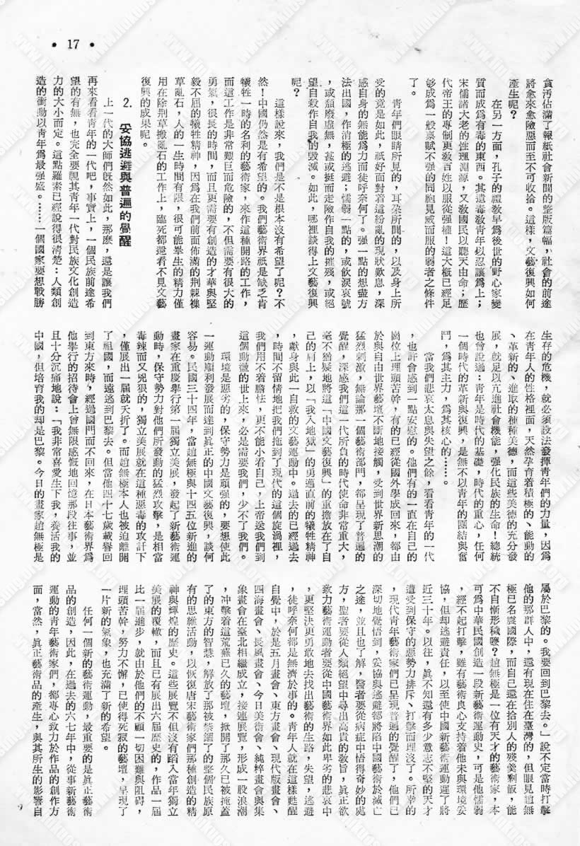 任何一個新的藝術運動,最重要的是真正藝術品的創造,因此,在過去的六七年中,從事新藝術運動的青年藝術家們,都專心致力於作品的創造作方面,當然,真正藝術品的產生,與其所生的影響自然很大。可是我們却忽略了一件事,當我們的作品展覽的時候,有幾個人能真懂得呢?絕大多數的觀眾不了解新的藝術理論,也不知道藝術史的演變與發展,他們已看慣那種獻媚討好的「假畫」,當真正的藝術作品掛在眼前時,如何使他們換一種眼光來鑑賞呢?難道那些由於不了解而生的怨言與咒罵之聲充耳不聞嗎?我早已深深感覺,現代藝術工作者們在新理論新思潮的介紹工作上作的太少,如果我們不能將新思潮的介紹工作列為重要的一部分,新藝術運動將收到很大的限制;如果沒有新理論的發表來作為創作的支持,我們的作品是經不起時代的考驗的。觀眾都是藝術的擁護者,我們不應該將他們摒棄在新藝術的門外,應該幫忙他們,指引他們,以免由於誤解而產生很多不必要的阻碍。
