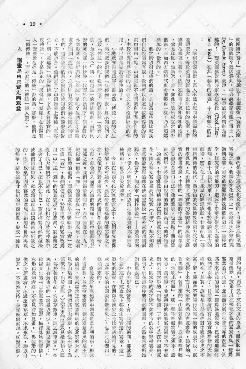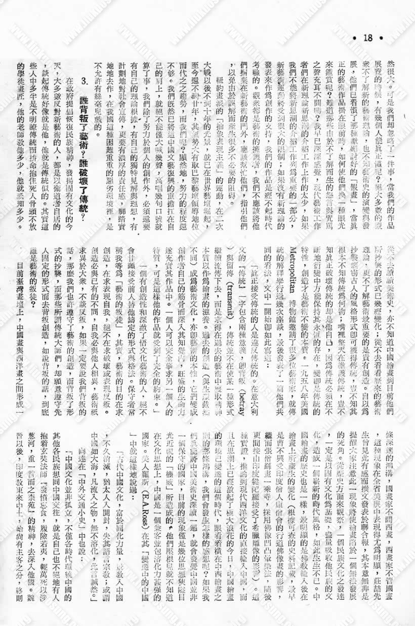在政府提倡恢復民族精神,發揚固有文化的今天,大多數反對新藝術的人,都是以衛道者自居的,談起傳統好像就是他,他就是傳統似的。其實這些人中多半是不明瞭傳統而拚命抱住死人骨頭不放的學徒畫匠,他的老師教他多少,他就只知道多少。從不去讀讀美術史,亦不知道中國繪畫到目前他們所抄襲的形式已幾經變化;從不去看看歷來的藝術理論,更不了解藝術最重要的是貴有創造。自以為抄襲剽竊古人的風格形式即可獲得傳統,豈不知其根本不知道傳統為何物;嘴裡整天在維護傳統,豈不知真正破壞傳統的却是他自己,因為傳統必須在不斷地衍變中方能保持其永恆的存在,變即是傳統的特性,創造才是藝術不變的本質。一九五八年美國Metropolitan博物館邀請了很多為藝術家,就傳統的解釋舉行過幾次座談,最後發表了一篇他們共同的看法,文中一開始即如此寫道: