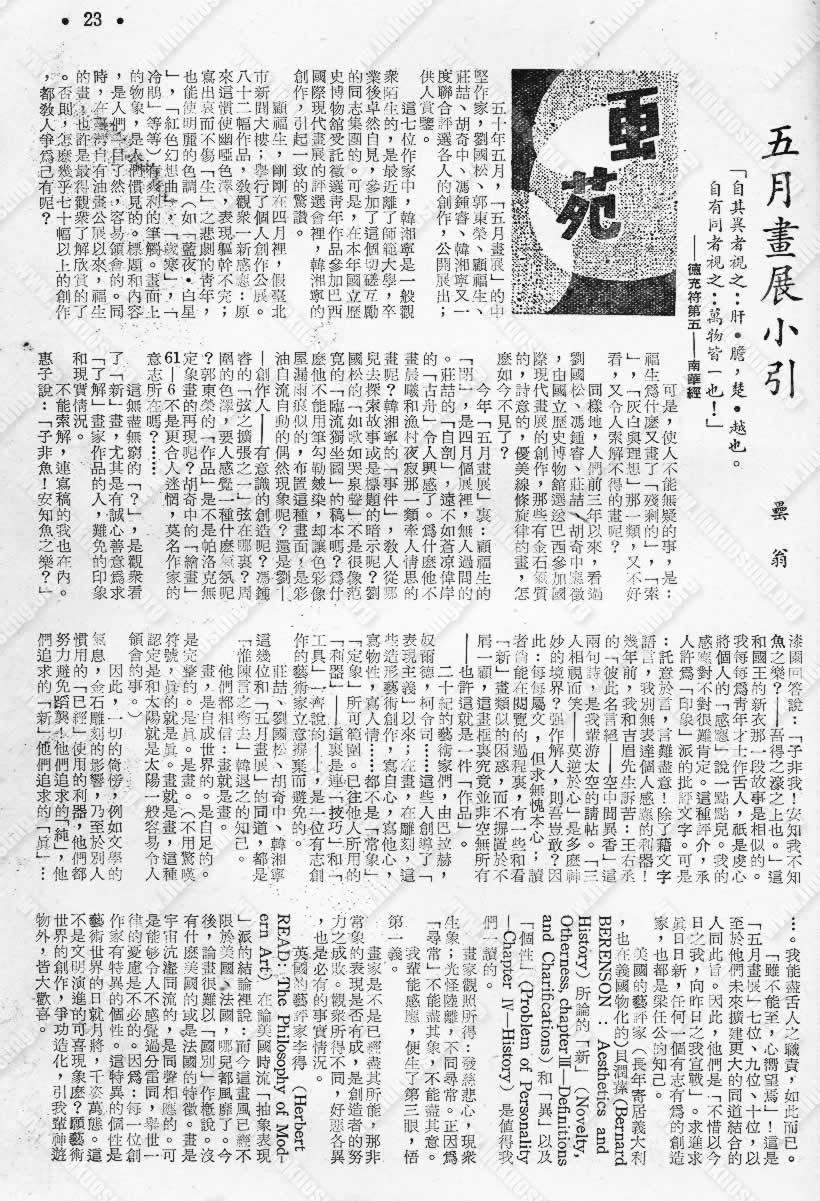 今年「五月畫展」裏:顧福生的「閉」,是四月個展裡,無人過問的。莊喆的「自剖」,遠不如蒼涼偉岸的「古舟」令人興感了。為什麼他不畫晨曦和漁村夜寂那一類牽人情思的畫呢?韓湘寧的「事件」,教人從哪兒去探索故事或是標題的暗示呢?劉國松的「如歌如哭泉聲」不是很像範寬的「臨流獨坐圖」的稿本嗎?為什麼他不能用筆勾勒皴染,卻讓色彩像屋漏雨痕似的,佈置這種畫面,是彩油自流自動的偶然現象呢?還是劉─創作人─有意識的創造呢?馮鍾睿的「弦之擴張之一」弦在哪裡?周圍的色澤,要人感覺一種什麼氣氛呢?郭東榮的「作品」是不是帕洛克無定象畫的再現呢?胡奇中的「繪畫」61-6不是更和人迷網,莫名作家的意志所在嗎?……