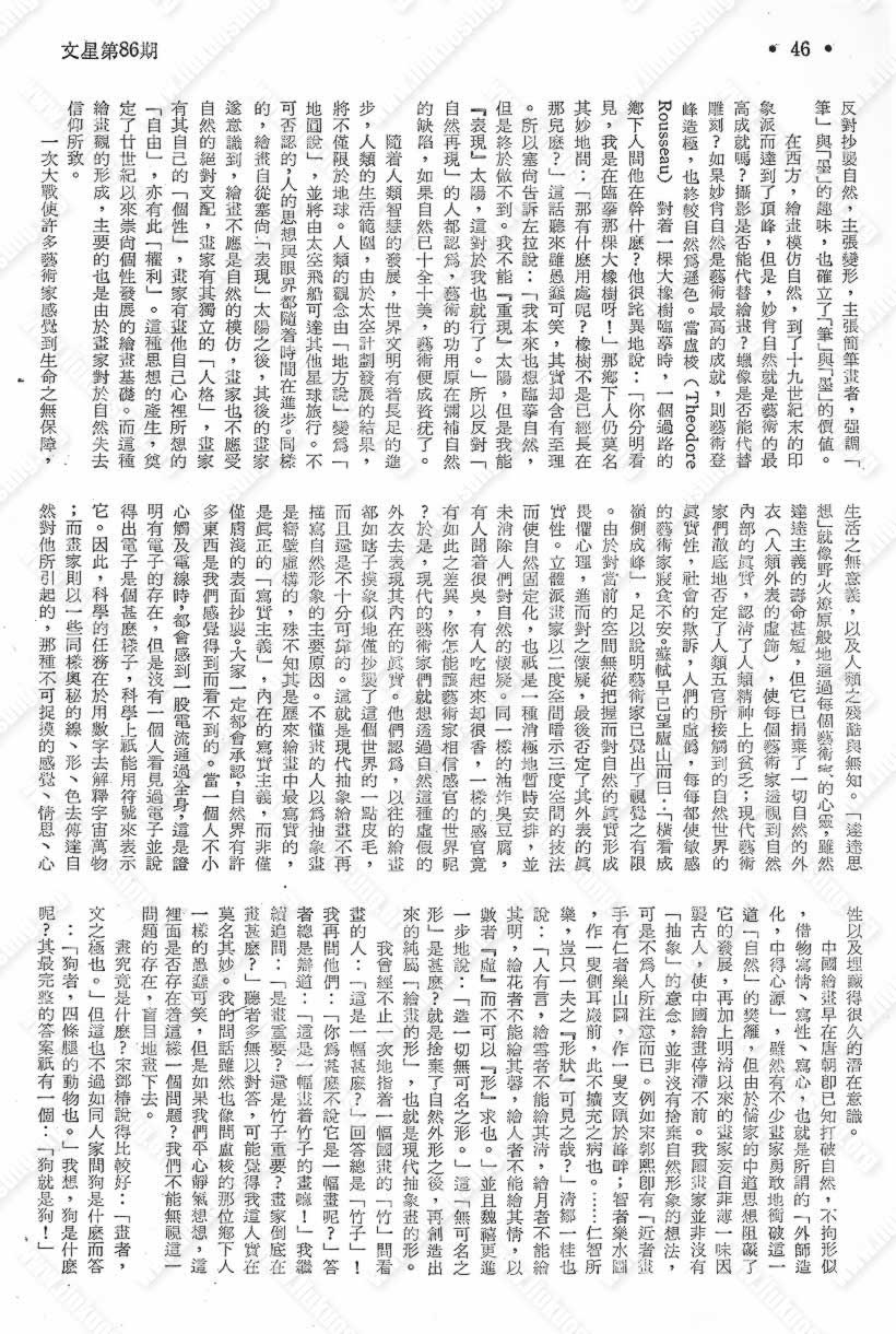 我曾經不止一次地指著一幅國畫的「竹」問著看畫的人:「這是一幅甚麼?」回答總是「竹子」!我再問他們:「你為甚麼不說它是一幅畫呢?」答者總是辯道:「這是一幅畫著竹子的畫麻!」我繼續追問:「是畫重要?還是竹子重要?畫家到底在畫甚麼?」聽者多無以對答,可能覺得我這人實在莫名其妙。我的問話雖然也像問盧梭的那位鄉下人一樣的愚蠢可笑,但是如果我們平心靜氣想想,這裡面是否存在著這個一個問題?我們不能無視這一問題的存在,盲目地畫下去。