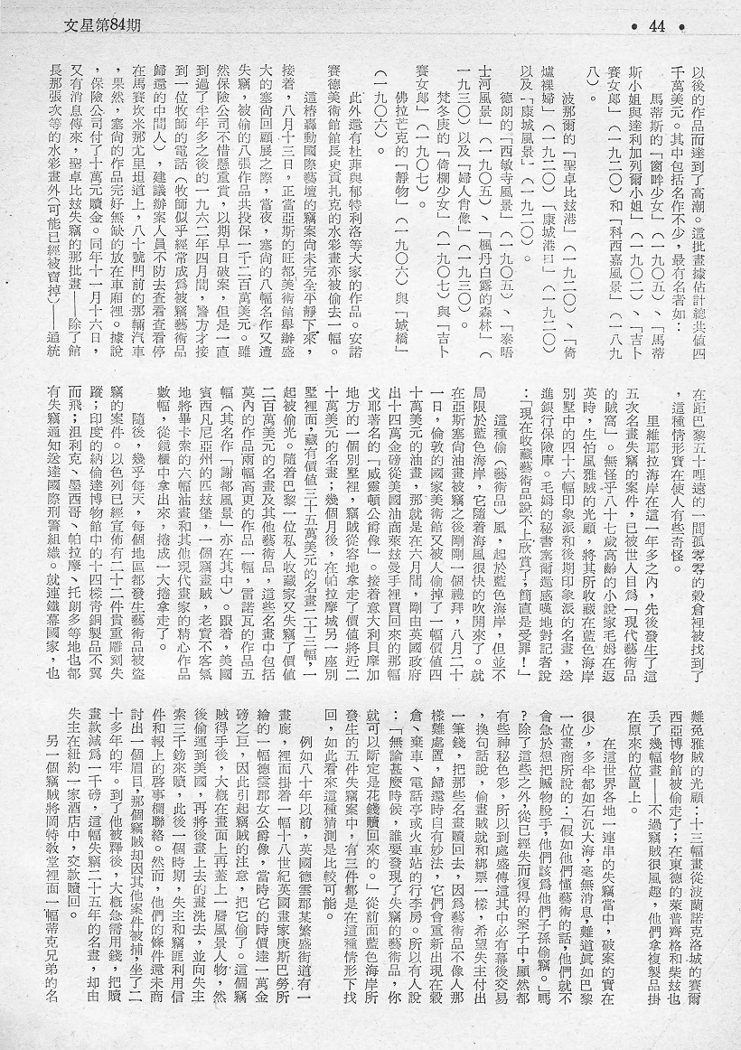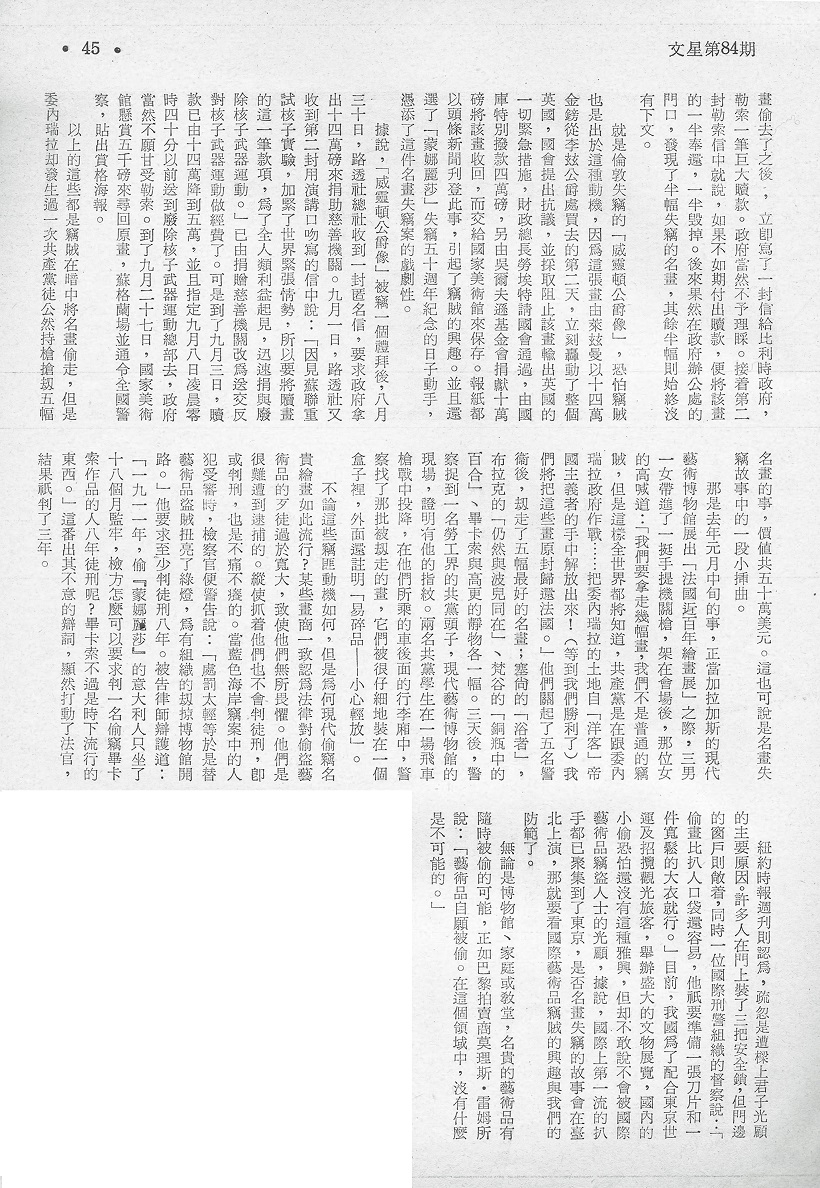 九月三日,徵信新聞報一天刊載了世界上三宗藝術品失竊的消息。一是拉菲爾的「華倫天諾的畫像」與「土鮑婁大天使」,以及安東尼奧‧麥西納的「自畫像」三幅文藝復興時期的傑作,在意大利葛羅塔費爾瑞塔近郊瑪薩莉塔卡羅提女伯爵的別墅中被偷,價值在三百萬美元上下;二是一尊青銅的奈及利亞十七世紀戰士雕像,在紐約一所私人的美術陳列館──卡里白契美術館中被竊,價值在五萬至六萬美元之間;三張是張大千的一幅梅花,由日本寄到宜蘭後失竊,價值據說可到十萬元新臺幣。這是一九六○年以來,一連串名貴藝術品失竊的延續,在這短短的四年當中,所遭盜竊的藝術品的總價,大概已在一千萬到兩千萬美元之間。