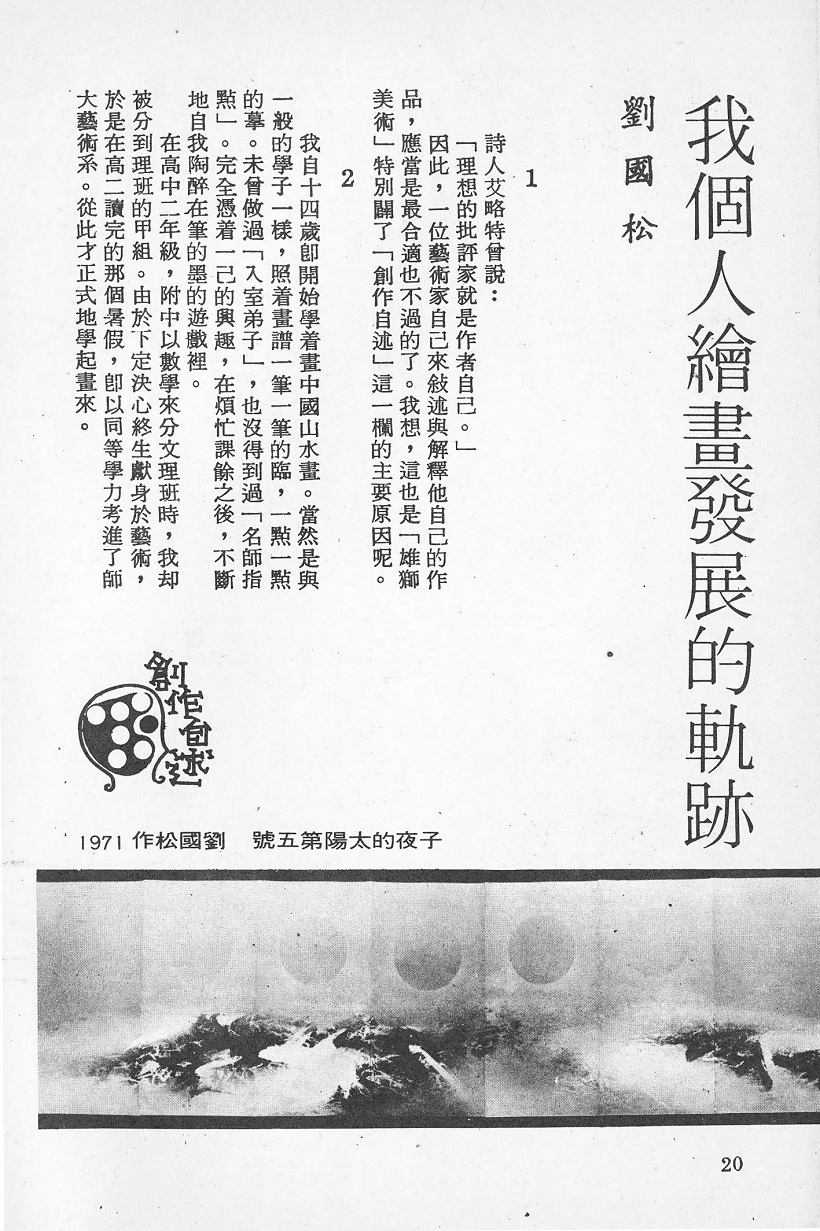 大二那年,我突然觉得,使我陶醉了将近六年的中国画,对我已失去了吸引力,好像已觉得无路可走。在那同时,我又逐渐地由画报杂志与西洋画册上,接触到一些西洋近代的艺术新形式、新风格。使我对西洋的新艺术非常向往。于是,除了上国画课之外,我已几乎将我的全幅精神投在西画的研究上。我开始模仿塞尙、梵谷、马谛斯、毕加索、克利、夏迦尔……乃至抽象表现派的帕洛克。可是到了我毕业三年以后的一九五九年,我对于西洋现代绘画的模仿才告一段落。在那一年,西洋绘画给我的感觉,就如同大二那年中国绘画给我的感觉一样,已不再新鲜。同时我更觉得,这样一味地模仿西洋也不是我应该作的。在那之前,我虽然早已淸晰地了解「艺术的本质是创造,艺术的目的在表觋」,但却误以为跟西洋创作思想、模仿世界最新画风卽获得了创造,而还大言不惭地批评模仿传统形式的画家们不懂创造之为何物。可是,到了一九五九年初,我经过一段长时间地深思与反省之后,我领悟出「五十步笑百步」的「幼稚病」的「可笑」了。就在那个时间,我写下了两句话,做为我个人以后从事创作的座右铭。那就是: