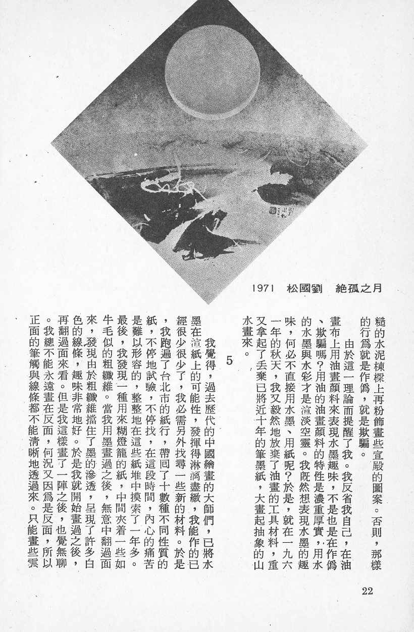 比如说,当我第一次看见范宽的那幅名作「溪山行旅」时,所受到的感动是难以形容的。但是这种感动却不知觉地在我的「矗立」表现出来,这是一九六六年,在我第一次获得洛克非勒三世基金会奖金作环球旅行之前所作的。可是当我在美国看到了当时流行的硬边艺术之后,自然而然又受到了影响。我于是试着将西方理性的几何形体,运用到我的画上去,使其与东方流动的线条相调和,就在一九六七年画出一些如「窗里窗外」的画,而将「矗立」上方暗示山头的拼贴变成了方形。随着又受欧普艺术的影响,在一九六八至一九六九年初,又画了一批「中秋节」的画式来,再将方形的拼贴中加上一圆。但是等到一九六九年初,我在电视上及报章杂志上,看到了阿波罗七号宇宙飞船由月球背面所摄得地球照片时,非常激动。同时觉得月球表面的弧与地球的圆所构成的那个画面,实在完美得不得了。于是,我就自然而然地将「中秋月」上方的方块拿掉,而剩下了一个圆,再将下面的流动线条上头加了一个弧线,于是就画出了我的第一幅太空画──地球何许?。
