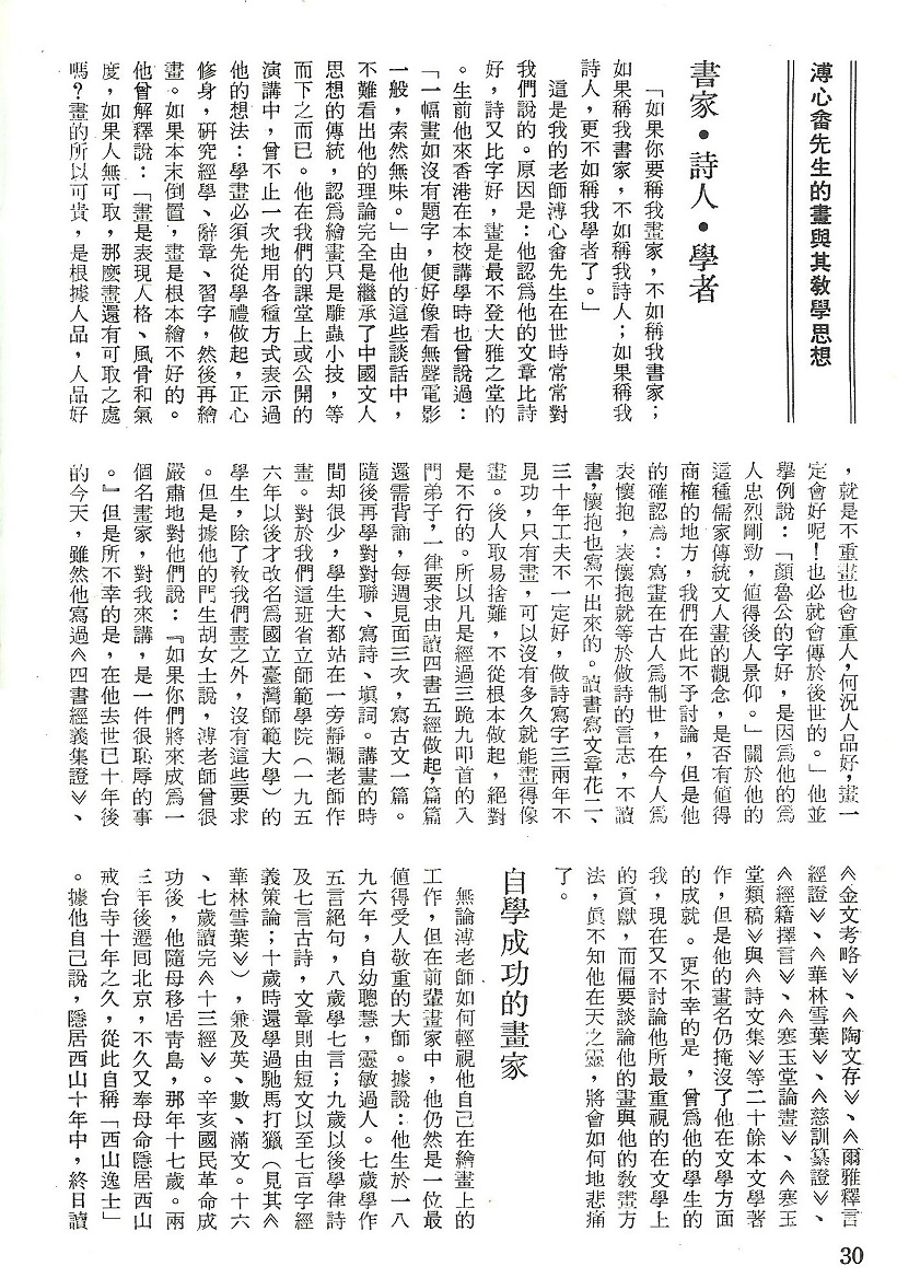 這是我老師溥心畬先生在世時常常對我們說的。原因是:他認為他的文章筆詩好,詩又比字好,畫是最不登大雅之堂的。生前他來香港在本校講學時也曾說過:「一幅畫如沒有題字,便好像看無聲電影一般,索然無味。」由他的這些談話中,不難看出他的理論完全是繼承了中國文人思想的傳統,認為繪畫只是雕蟲小技,等而下之而已。他在我們的課堂上或公開的演講中,曾不止一次地用各種方式表示過他的想法:學畫必須先從學禮做起,正心修身,研究經學、辭章、習字,然後再繪畫。如果本末倒置,畫是根本繪不好的。他曾解釋說:「畫是表現人格、風骨和氣度,如果人無可取,那麼畫還有可取之處嗎?畫的所以可貴,是根據人品,人品好,就是不重畫也會重人,何況人品好,畫一定或好呢!也必就會傳於後世的。」他並舉例說:「顏魯公的字好,是因為他的為人忠烈剛勁,值得後人景仰。」關於他的這種儒家傳統文人畫的觀念,是否有值得商榷的地方,我們在此不予討論,但是他確認為:寫畫在古人為制世,在今人為表懷抱,表懷抱就等於做詩的言志,不讀書,懷抱也寫不出來的。讀書寫文章花二、三十年功夫不一定好,作詩寫字兩三年不見功,只有畫,可以沒有多久就能畫得像畫。後人取易捨難,不從根本做起,絕對是不行的。所以凡是經過三跪九叩首的入門弟子,一律要求讀四書五經做起,篇篇還需背誦,每週見面三次,寫古文一篇。隨後再學對對聯、寫詩、填詞。講畫的時間却很少,學生大都站在一旁靜觀老師作畫。對於我們這班省立師範學院(一九五六年以後才改名為國立臺灣師範大學)的學生,除了敎我們畫之外,沒有這些要求。但根據他的門生胡女士說,溥老師曾很嚴肅地對他們說:『如果你們將來成為一個名畫家,對我來講,是一件很恥辱的事。』但是不幸的是,在他去世已十年後的今天,雖然他寫過《四書精義集證》、《金文考略》、《陶文存》、《爾雅釋言經證》、《華林雪葉》、《慈訓纂證》、《經籍擇言》、《寒玉堂論畫》、《寒玉堂類稿》與《詩文集》等二十餘本文學著作,但是他的畫名仍掩沒了他在文學方面的成就。更不幸的是,曾為他的學生的我,現在又不討論他所最重視的在文學上的貢獻,而偏要談論他的畫與他的敎畫方法,眞不知他在天之靈,將會如何地悲痛了。