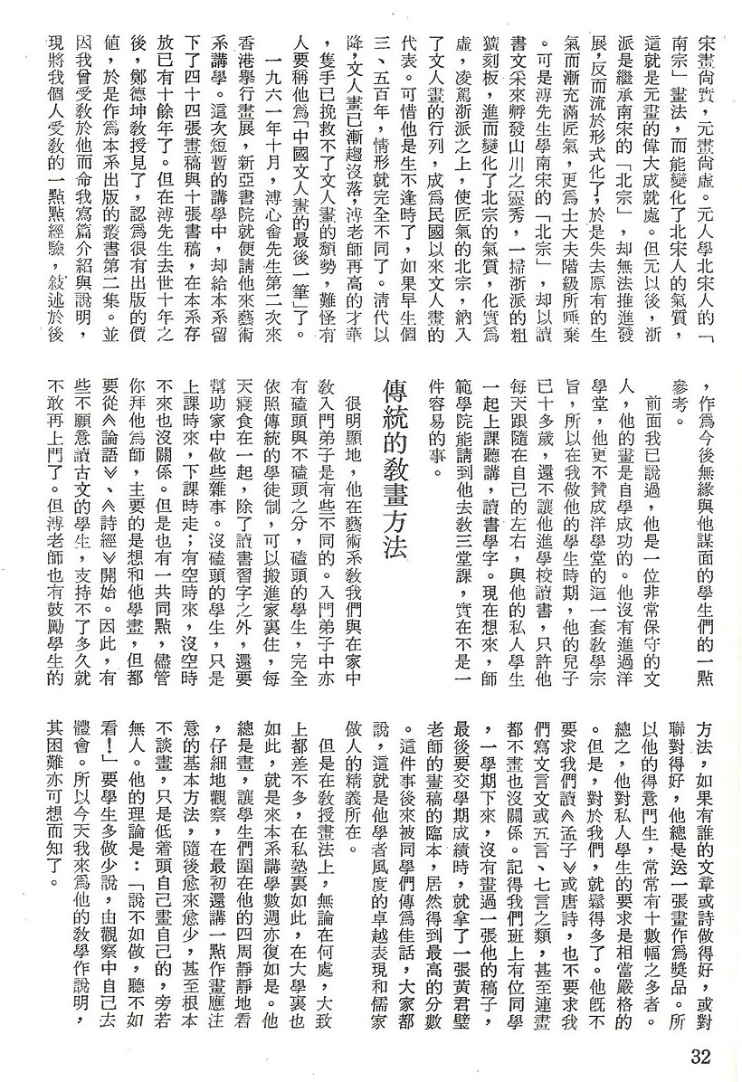 很明顯地,他在藝術系敎我們與在家中入門弟子是有些不同的。入門弟子中亦磕頭與不磕頭之分,磕頭的學生,完全依照傳統的學徒制,可以搬進家裏住,每天寢食在一起,除了讀書習字之外,還要幫助家中做些雜事。沒磕頭的學生,只是上課時來,下課時走;有空時來,沒空時不來也沒關係。但是也有一共同點,儘管你拜他為師,主要的是想和他學畫,但都要從《論語》、《詩經》開始。因此,有些不願意讀古文的學生,支持不了多久就不敢再上門了。但溥老師也有鼓勵學生的方法,如果有誰的文章或詩做得好,或對聯對得好,他總是送一張畫作為獎品。所以他的得意門生,常常有十數幅之多者。總之,他對私人學生的要求是相當嚴格的。但是,對於我們,就鬆得多了。他旣不要求我們讀《孟子》或唐詩,也不要求我們寫文言文或五言、七言之類,甚至連畫都不畫也沒關係。記得我們班上有位同學,一學期下來,沒畫過一張他的稿子,最後要交學期成耫時,就拿了一張黃君璧老師的畫稿的臨本,居然得到最高的分數。這件事後來被同學們傳佳話,大家都說,這就是他學者風度的卓越表現和儒家做人的精義所在。