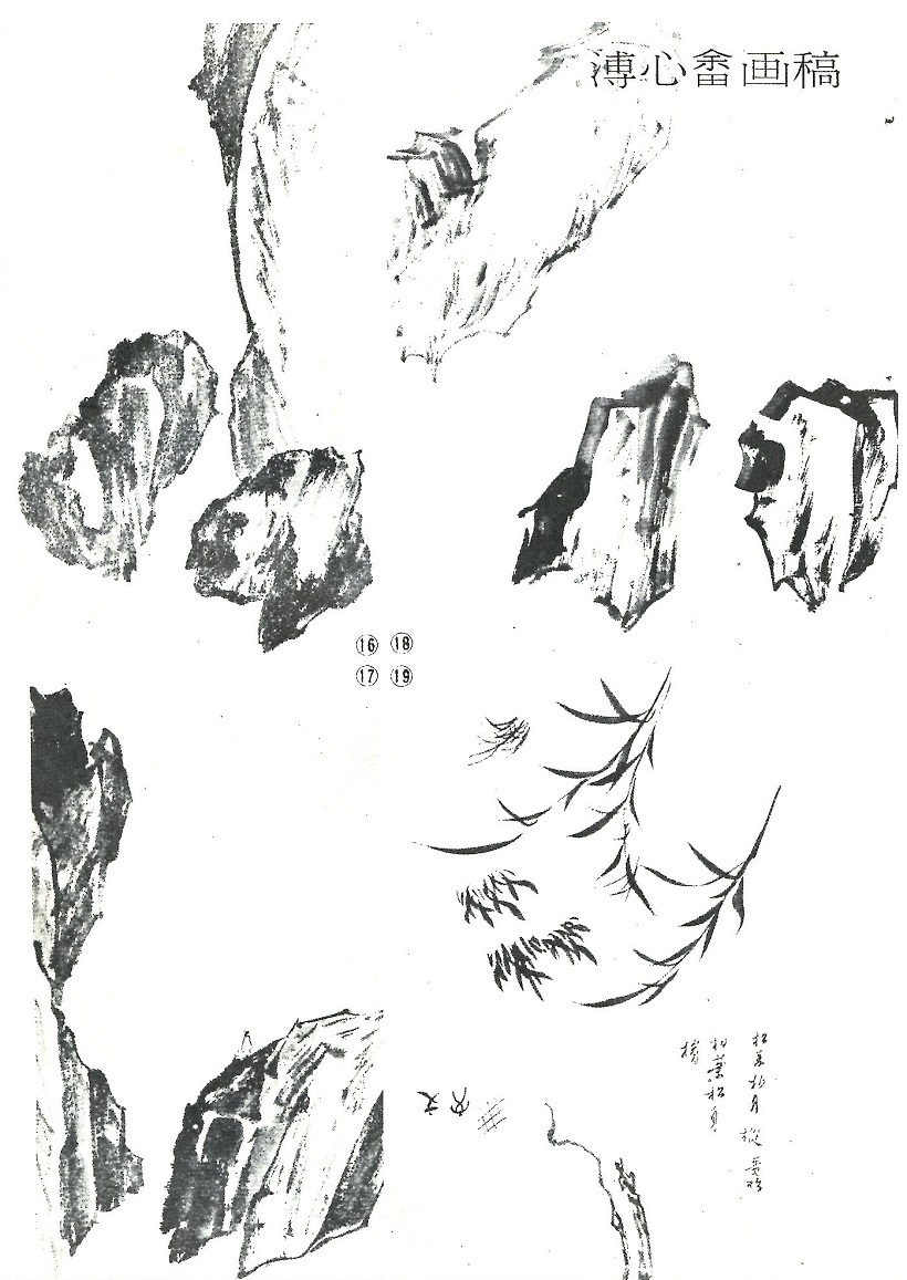 除敎披麻、解索、雨點和芝麻等皴法之外,也會敎些小斧劈(圖十二)與大斧劈或長斧劈(圖十六、圖十七和圖十八)等。在示範這些不同皴法的用筆時,他也常常談些何時該用中鋒,何時非用偏鋒不可的秘訣,對學生是很有帬助的。