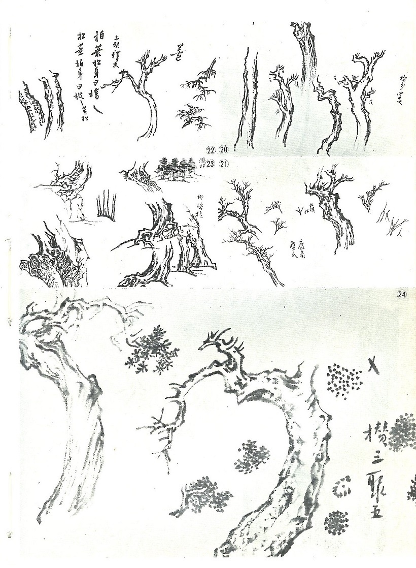 畫樹幹的線條基本上與畫石相同,唯有畫枝,落筆與收筆,以及執筆運行時都略有不同,落筆時重,收筆時輕,線條均匀而無頓挫(圖二十一)。向上行者謂之「鹿角」,向下行者謂之「蟹爪」。樹幹的輪廓當然與樹的種類很有關係,但是樹幹內的皴法却是決定樹的性質的最大因素。譬如說:柏樹所用的皴法應該是披麻解索,而松樹所用的皴法應該是雨點、芝蔴和小斧劈之類。但是在松柏之間還有第三、第四種樹,溥老師吿訴我們:「《爾雅》釋木:柏葉松身曰檜,松葉柏身曰樅。」枝幹畫過後,再畫樹葉,柏葉所用的稱柏葉點,是與胡椒點與鼠足點相類的。點時用中鋒筆尖,採攢三聚五的方法,圍着圈子點,一團一團的棸集在一起。決不可太散,太散而太平,沒有厚度。(圖二十二和圖二十四)再後還學畫樹根。樹有露根與不露根之分,一般的小樹、襍樹,或生長在平地上、土坡上的樹,大都是不露根的。唯有松、柏、柳、榕和槐樹,或生長在石山的樹,大都是露根的。不露根的樹根無從畫起,唯有露出地面的根才有得畫,所以學畫根,也就是畫各種各樣暴露在空氣中、日光下的樹了。其實畫樹根的技法是與畫樹幹樹枝的沒有多大區别的(圖二十三)。只有松樹的葉子,也就是松針,與這些用筆都不同。畫石畫樹所講究的是起伏頓挫,而畫松針是非單槍直入不可;前者行筆要慢,後者行筆則非快不可。溥老師並吿訴我們畫松葉的妙訣,就是每一團松針是不可平列在樹枝上,一定要有部份重疊在一起。否則,就沒有前後之分,就平板、不够厚,沒有深度。(圖二十五、二十六和二十七)由這兩幅圖中我們也可以看到,溥先生只畫一種松樹,那就是李成所創造出來的這種秀美的形式,這種形式,在他手中也沒有多大的改變,只是在姿態上面更娟秀而已。