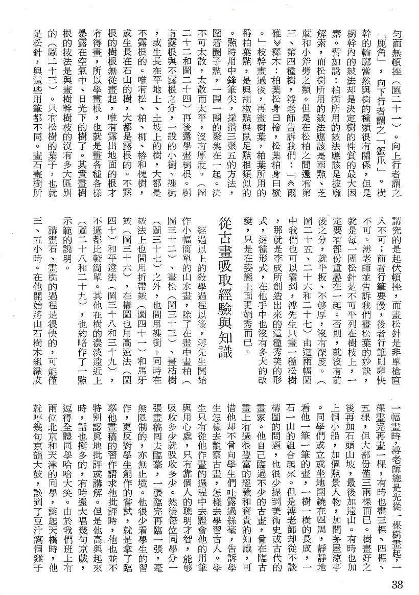 經過以上的敎學過程以後,溥先生開始作小幅簡單的山水畫,除了在畫中畫柏( 圖三十二)、畫松(圖三十三)、畫枯樹(圖三十七)之外,也間用襍樹。同時在皴法上也間用折帶皴(圖四十一)和馬牙皴(圖三十六),在構圖也用高遠法(圖四十)和平遠法(圖三十八和三十九)不過都比較簡單。其他在樹的濃淡遠近上(圖二十八和二十九),也約略作了一點示範的說明。