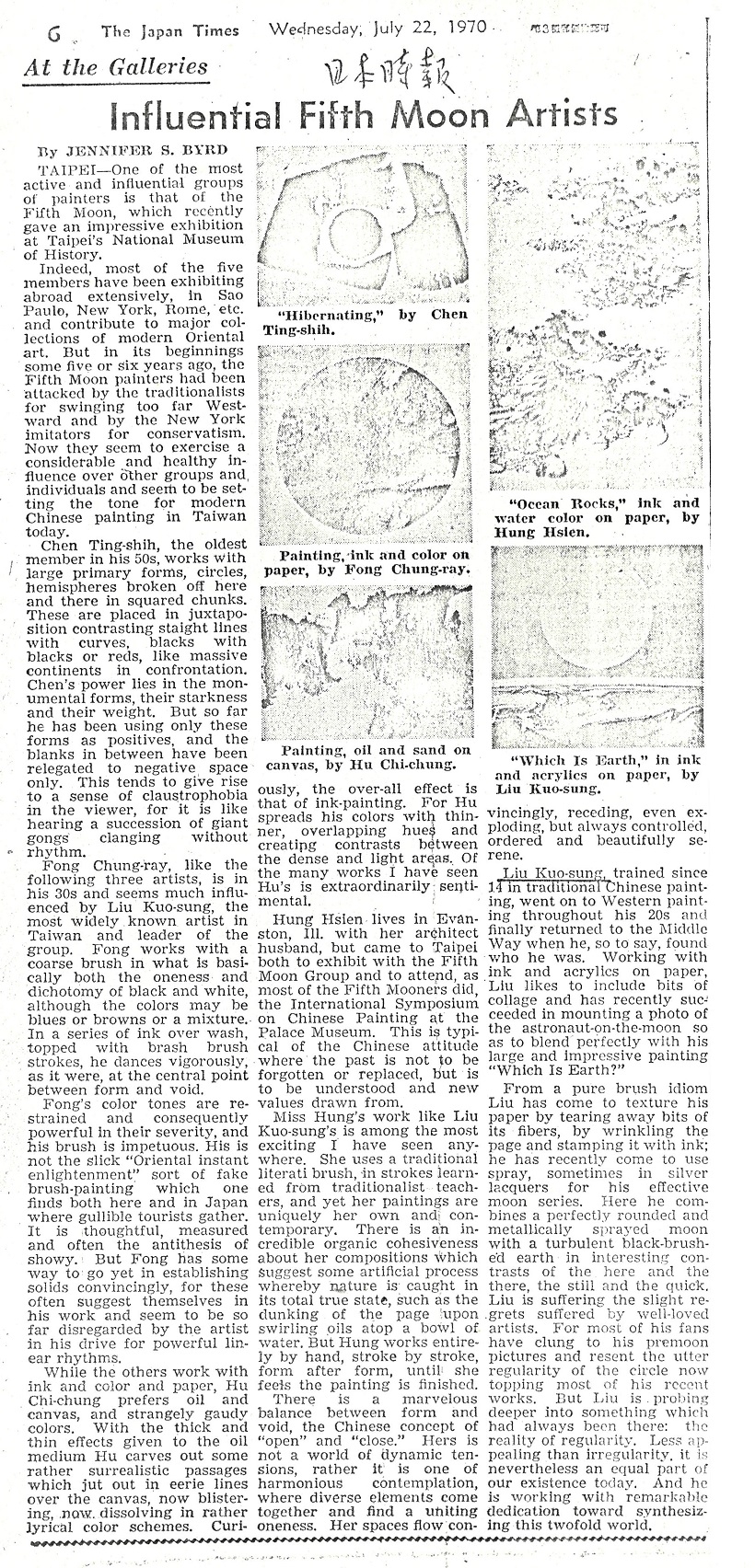 Indeed, most of the five members have been exhibiting abroad extensively, in Sao Paulo, New York, Rome, etc. and contribute to major collections of modern Oriental art. But in its beginnings some five or six years ago, the Fifth Moon painters had been attacked by the traditionalists for swinging too far Westward and by the New York imitators for conservatism. Now they seem to exercise a considerable and healthy influence over other groups and individuals and seem to be setting the tone for modern Chinese painting in Taiwan today.