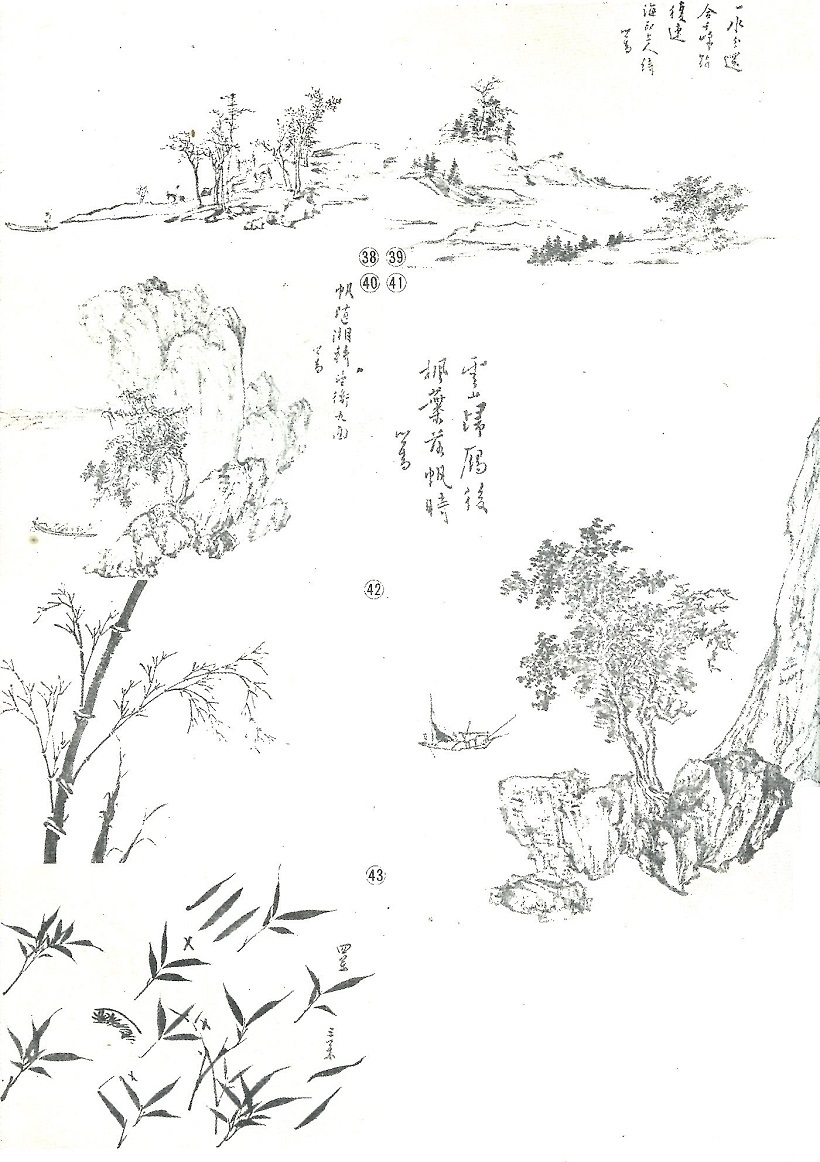 經過以上的敎學過程以後,溥先生開始作小幅簡單的山水畫,除了在畫中畫柏( 圖三十二)、畫松(圖三十三)、畫枯樹(圖三十七)之外,也間用襍樹。同時在皴法上也間用折帶皴(圖四十一)和馬牙皴(圖三十六),在構圖也用高遠法(圖四十)和平遠法(圖三十八和三十九)不過都比較簡單。其他在樹的濃淡遠近上(圖二十八和二十九),也約略作了一點示範的說明。