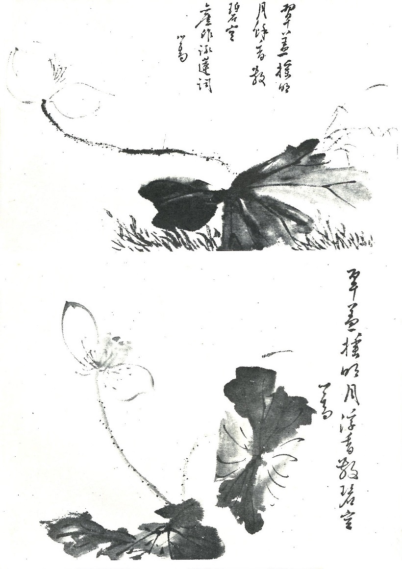 由其餘的畫稿中,我們也可看到,他除了敎學生畫山水之外,也畫點草蟲、蔬菜、花鳥與人物。在這些畫稿中,除了在用墨上多一些渲染之外,用筆上大致與山水一相同,只是有些較為流輰些罷了。