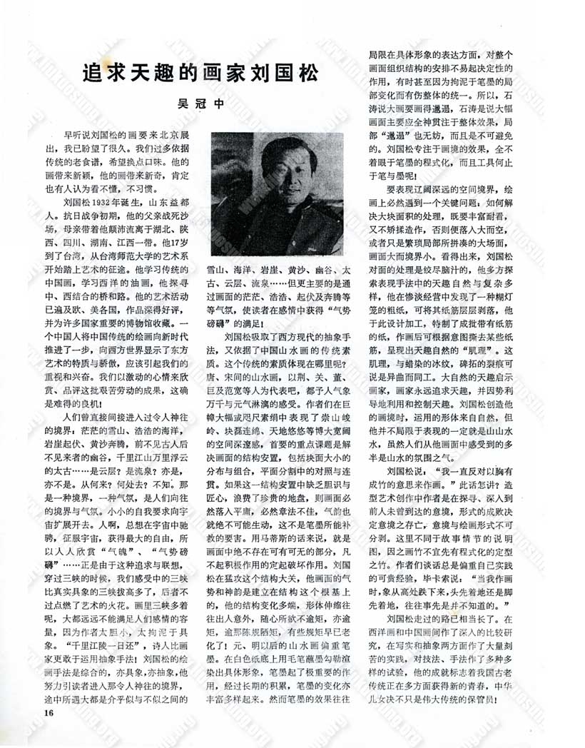 刘国松1932年诞生,山东益都人。在抗日战争初期,他的父亲战死沙场,母亲带着他颠沛流离于湖北、陕西、四川、湖南、江西一带。他17岁到了台湾,从台湾师范大学的艺术系开始踏上他艺术的征途。他学习传统的中国画,学习西洋的油画,他探寻中西结合的桥和路。他的艺术活动已遍及欧、美各国,作品深得好评,为许多国家重要的博物馆收藏。一个中国人将中国传统的绘画向新时代推进了一步,向西方世界显示了东方艺术的特质与骄傲,应该引起我们的重视和兴奋,我们以激动的心情来欣赏、品评这批艰苦劳动的成果,这确是难得的良机!
