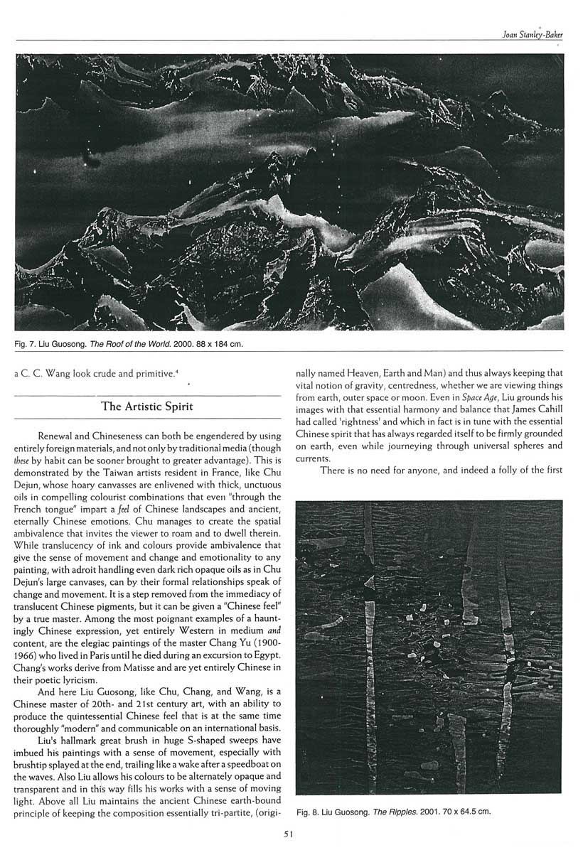 It has never been the medium of ink brush and paper that has become outdated, as so many “modern revolutionaries” still believe. It is the creative mind of Chinese people that in the past 120 years or so has been reduced to self-doubt, so much so as to become blind to the infinite potential of Chinese tradition in its ever possible renewal. Works by Liu Guosong, abstract or less so, always allow us to wander, to stop, to roam and to dwell anywhere in them. No matter how “modern looking” or in which style – dipped over an oiled water surface, done with huge brushes, with fine brushes or without brush at all – there is in Liu’s works always that inimitable Chinese feel that keep the works within Tradition.5 But due to their innovative and abstract imagery, his oeuvre is at the same time creative and contemporary. Free from the bond of our having to identify a house or a horse, a bowl of fruit or a telephone from his picture, we are released into the timeless contemplation of the internal music that is the true essence of art, where soul touches soul, mood inspires mood, without extraneous crutches. Although Liu Guosong had come to Chinese tradition from a background of “modern” (that is Western) painting practices, he has since given his whole life to searching out the root and expression of Chinese painting itself, and has given Chinese painting a Contemporary and International place in world art.