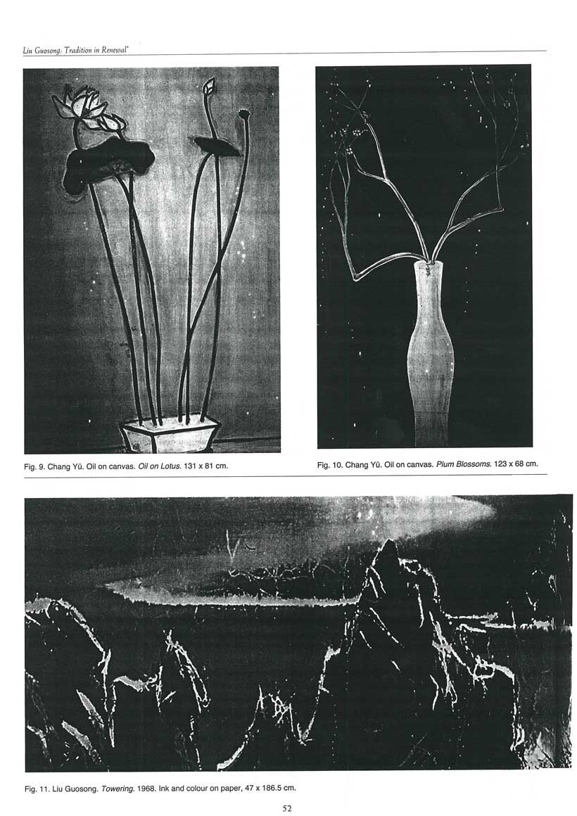 Renewal and Chineseness can both be engendered by using entirely foreign materials, and not only by traditional media (though these by habit can be sooner brought to greater advantage). This is demonstrated by the Taiwan artists resident in France, like Chu Dejun, whose hoary canvasses are enlivened with thick, unctuous oils in compelling colourist combinations that even “through the French tongue” impart a feel of Chinese landscapes and ancient, eternally Chinese emotions. Chu manages to create the spatial ambivalence that invites the viewer to roam and to dwell therein. While translucency of ink and colours provide ambivalence that give the sense of movement and change and emotionality to any painting, with adroit handling even dark rich opaque oils as in Chu Dejun’s large canvases, can by their formal relationships speak of change and movement. It is a step removed from the immediacy of translucent Chinese pigments, but it can be given a “Chinese feel” by a true master. Among the most poignant examples of a hauntingly Chinese expression, yet entirely Western in medium and content, are the elegiac paintings of the mater Chang Yu (1900-1966) who lived in Paris until he died during an excursion to Egypt. Chang’s works derive from Matisse and are yet entirely Chinese in their poetic lyricism.