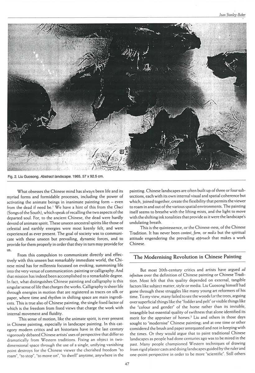It has never been the medium of ink brush and paper that has become outdated, as so many “modern revolutionaries” still believe. It is the creative mind of Chinese people that in the past 120 years or so has been reduced to self-doubt, so much so as to become blind to the infinite potential of Chinese tradition in its ever possible renewal. Works by Liu Guosong, abstract or less so, always allow us to wander, to stop, to roam and to dwell anywhere in them. No matter how “modern looking” or in which style – dipped over an oiled water surface, done with huge brushes, with fine brushes or without brush at all – there is in Liu’s works always that inimitable Chinese feel that keep the works within Tradition.5 But due to their innovative and abstract imagery, his oeuvre is at the same time creative and contemporary. Free from the bond of our having to identify a house or a horse, a bowl of fruit or a telephone from his picture, we are released into the timeless contemplation of the internal music that is the true essence of art, where soul touches soul, mood inspires mood, without extraneous crutches. Although Liu Guosong had come to Chinese tradition from a background of “modern” (that is Western) painting practices, he has since given his whole life to searching out the root and expression of Chinese painting itself, and has given Chinese painting a Contemporary and International place in world art.