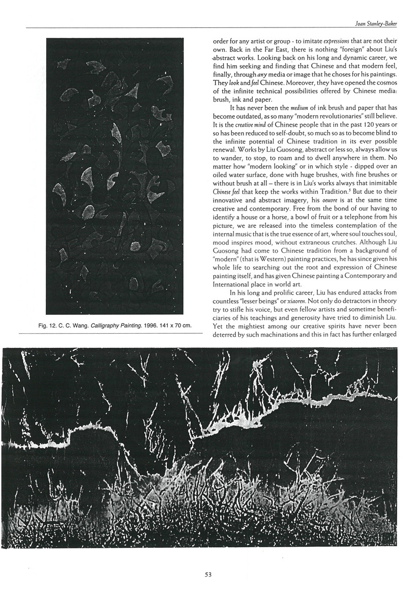 It has never been the medium of ink brush and paper that has become outdated, as so many “modern revolutionaries” still believe. It is the creative mind of Chinese people that in the past 120 years or so has been reduced to self-doubt, so much so as to become blind to the infinite potential of Chinese tradition in its ever possible renewal. Works by Liu Guosong, abstract or less so, always allow us to wander, to stop, to roam and to dwell anywhere in them. No matter how “modern looking” or in which style – dipped over an oiled water surface, done with huge brushes, with fine brushes or without brush at all – there is in Liu’s works always that inimitable Chinese feel that keep the works within Tradition.5 But due to their innovative and abstract imagery, his oeuvre is at the same time creative and contemporary. Free from the bond of our having to identify a house or a horse, a bowl of fruit or a telephone from his picture, we are released into the timeless contemplation of the internal music that is the true essence of art, where soul touches soul, mood inspires mood, without extraneous crutches. Although Liu Guosong had come to Chinese tradition from a background of “modern” (that is Western) painting practices, he has since given his whole life to searching out the root and expression of Chinese painting itself, and has given Chinese painting a Contemporary and International place in world art.