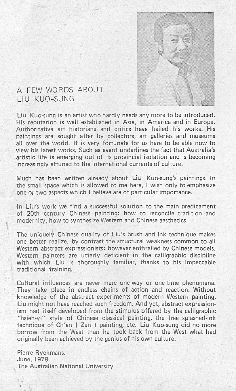 Liu Kuo-sung is an artist who hardly needs any more to be introduced. His reputation is well established in Asia, in America and in Europe. Authoritative art historians and critics have hailed his works. His paintings are sought after by collectors, art galleries and museums all over the world. It is very fortunate for us here to be able now to view his latest works. Such an event underlines the fact that Australia’s artistic life is emerging out of its provincial isolation and is becoming increasingly attuned to the international currents of culture.