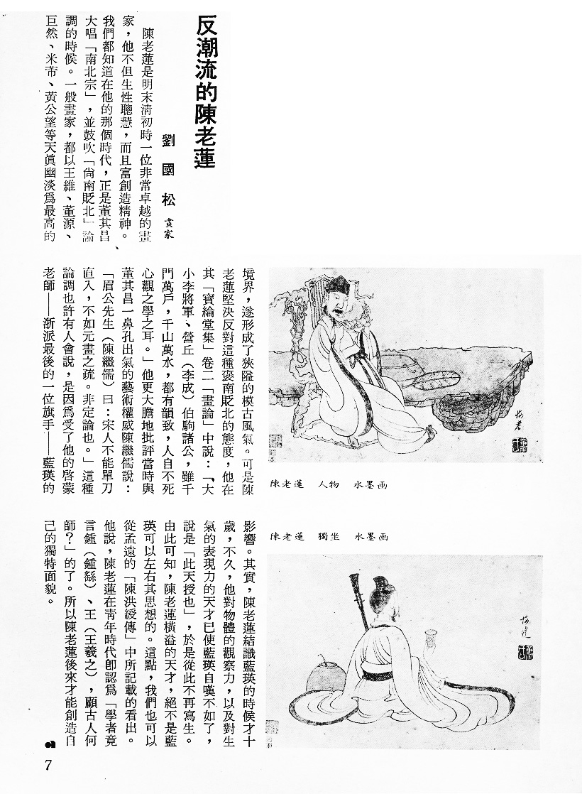 陈老莲是明末淸初时一位非常卓越的画家,他不但生性聪慧,而且富创造精神。我们都知道在他的那个时代,正是董其昌大唱「南北宗」,并鼓吹「尚南贬北」论调的时候。一般画家,都以王维、董源、巨然、米芾、黄公望等天眞幽淡为最高的境界,遂形成了狭隘的模古风气。可是陈老莲坚决反对这种褒南贬北的态度,他在其「宝纶堂集」卷二「画论」中说:「天小李将军丶营丘(李成)伯驹诸公,虽千门万户,千山万水,都有韵致,人自不死心观之学之耳。」他更大胆地批评当时与董其昌一鼻孔出气的艺术权威陈继儒说:「眉公先生(陈继儒)曰:宋人不能单刀直入,不如元画之疏。非定论也。」这种论调也许有人会说,是因为受了他的启蒙老师──浙派最后的一位旗手──蓝瑛的影响。其实,陈老莲结识蓝瑛的时候才十岁,不久,他对物体的观察力,以及对生气的表现力的天才已使蓝瑛自叹不如了,说是「此天授也」,于是从此不再写生。由此可知,陈老莲横溢的天才,绝不是蓝瑛可以左右其思想的。这点,我们也可以从孟远的「陈洪绶传」中所记载的看出。他说,陈老莲在靑年时代卽认为「学者竟言钟(钟繇)、王(王羲之) ,顾古人何师?」的了。所以陈老莲后来才能创造自己的独特面貌。