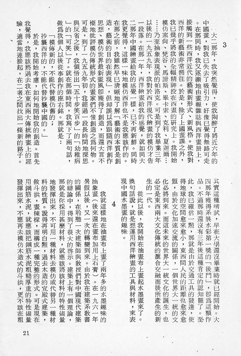 我就这样地在油画布上画了两年多的水墨趣味的抽象画(后来还在画布加用上石膏)。在一九六一年暑假以后,又一次的转变到来。由于我在建筑系敎书的关系,在聆听一次建筑师与敎授们对中国现代建筑的辩论中,得到了很大的启示。建筑上有一个理论,那就是你采用甚么材料,就应该将该材料的特性尽量地发挥 出来,不可用一种材料去模仿或代替另一种材料的性质。说得再明白点,过去木造的宣殿式建筑,做斗拱,画栋梁,而构成一种完整的形式。可是现在用钢筋水泥,就应该把钢筋水泥粗糙厚重的特性尽量发挥出来,不应再去模仿木造式的斗拱,更不该在粗糙的水泥栋梁上再粉饰画些宣殿的图案。否则,那样的行为就是作伪,就是欺骗。