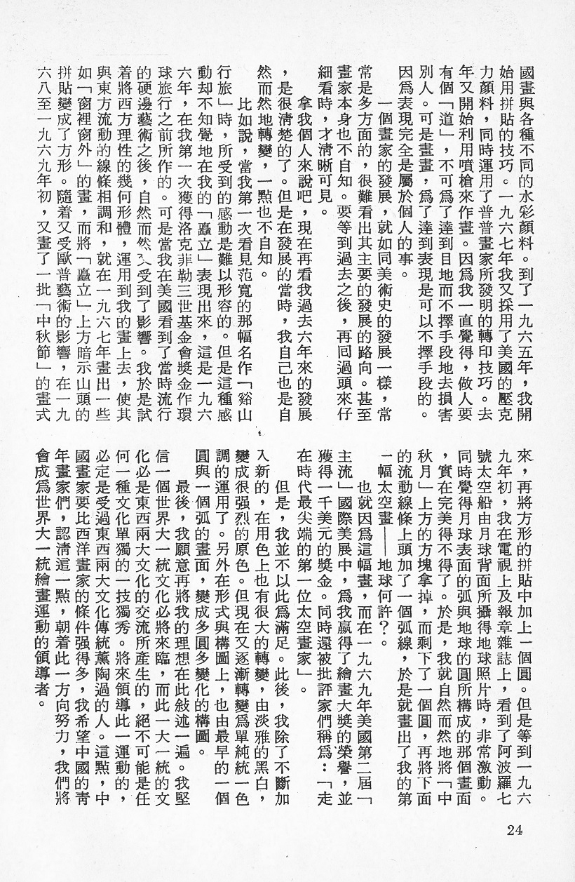 比如说,当我第一次看见范宽的那幅名作「溪山行旅」时,所受到的感动是难以形容的。但是这种感动却不知觉地在我的「矗立」表现出来,这是一九六六年,在我第一次获得洛克非勒三世基金会奖金作环球旅行之前所作的。可是当我在美国看到了当时流行的硬边艺术之后,自然而然又受到了影响。我于是试着将西方理性的几何形体,运用到我的画上去,使其与东方流动的线条相调和,就在一九六七年画出一些如「窗里窗外」的画,而将「矗立」上方暗示山头的拼贴变成了方形。随着又受欧普艺术的影响,在一九六八至一九六九年初,又画了一批「中秋节」的画式来,再将方形的拼贴中加上一圆。但是等到一九六九年初,我在电视上及报章杂志上,看到了阿波罗七号宇宙飞船由月球背面所摄得地球照片时,非常激动。同时觉得月球表面的弧与地球的圆所构成的那个画面,实在完美得不得了。于是,我就自然而然地将「中秋月」上方的方块拿掉,而剩下了一个圆,再将下面的流动线条上头加了一个弧线,于是就画出了我的第一幅太空画──地球何许?。