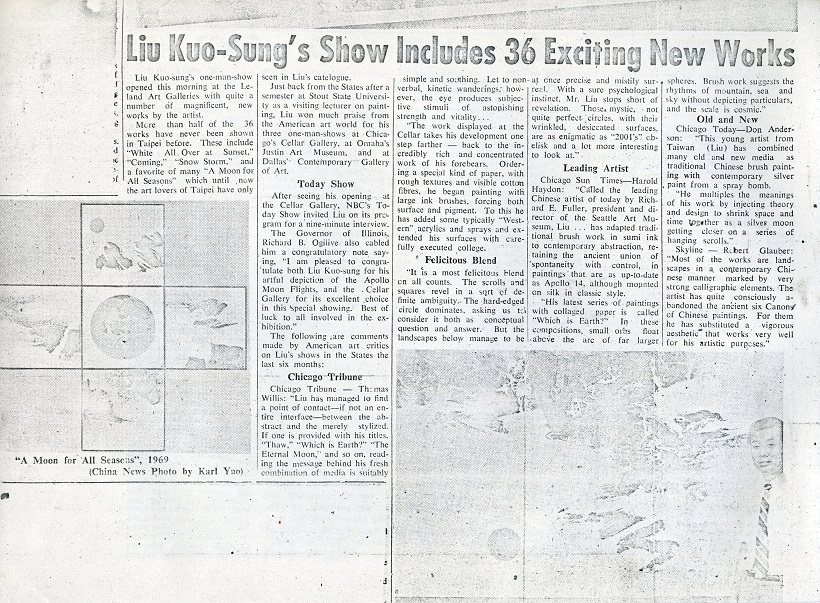 The Governor of Illinois, Richard B. Ogilive also cabled him a congratulatory note saying, “I am pleased to congratulate both Liu Kuo-sung for his artful depiction of the Apollo Moon Flights, and the Cellar Gallery for its excellent choice in this special showing. Best of luck to all involved in the exhibition.”