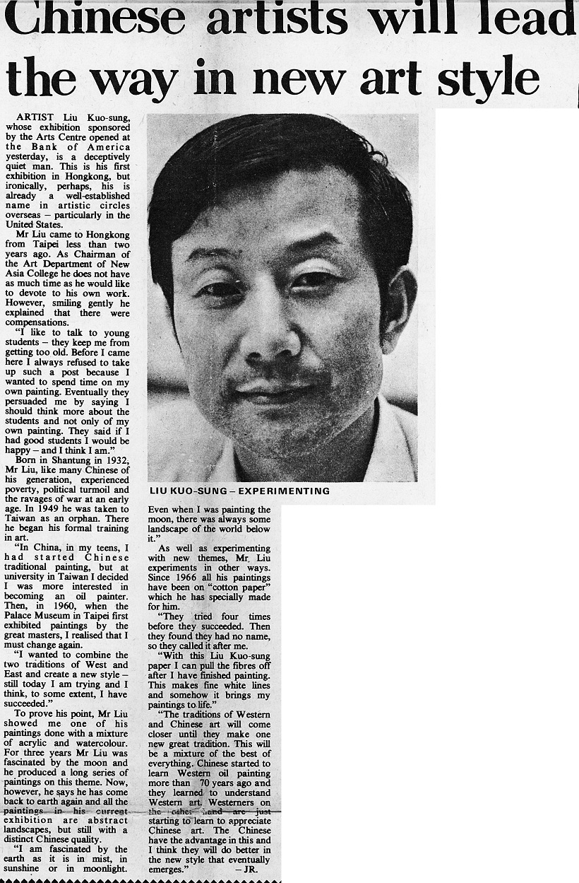 Mr. Liu came to Hong Kong from Taipei less than two years ago. As Chairman of the Art Department of New Asia College he does not have as much time as he would like to devote to his own work. However, smiling gently he explained that there were compensations.